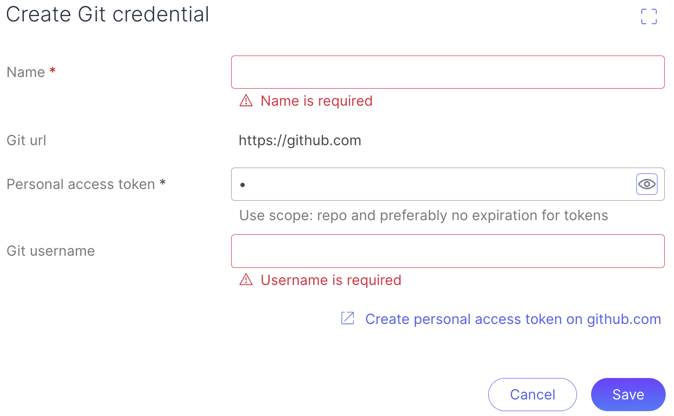 * **Git username** — This field **appears after entering the personal access token** and is extracted from your token.